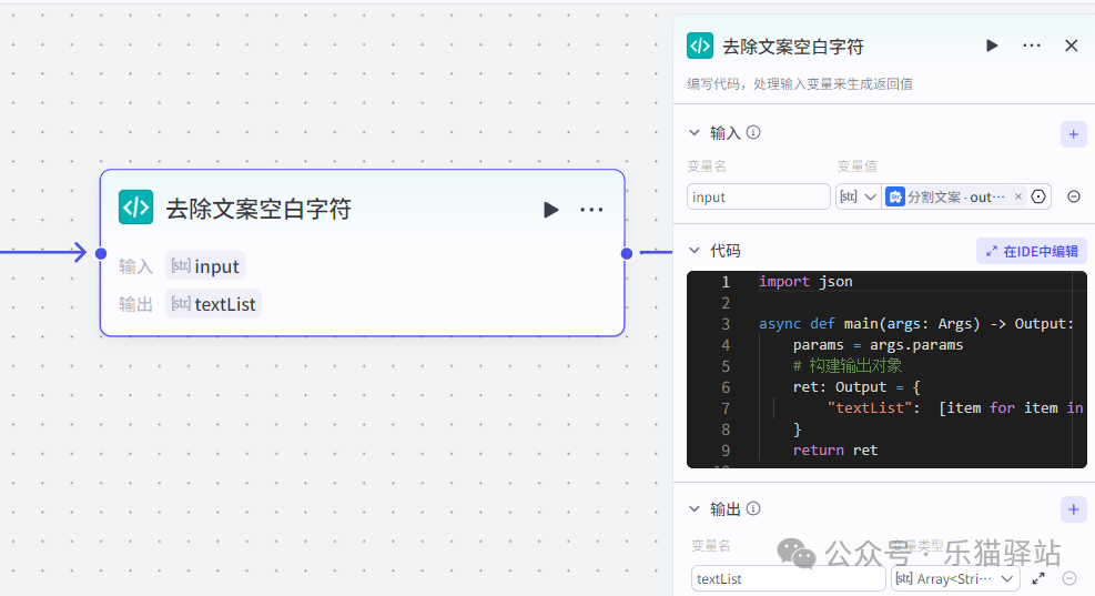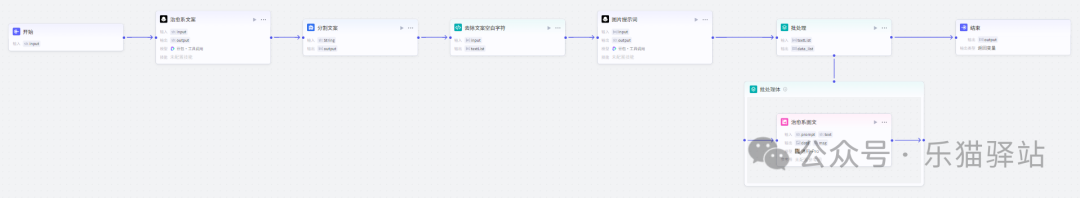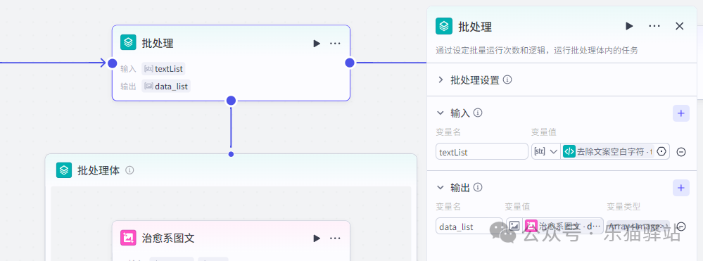 这里的我们需要使用【批处理】这个插件,输入的是 【去除空白字符】的输入,输出的【批处理】内部的处理集合