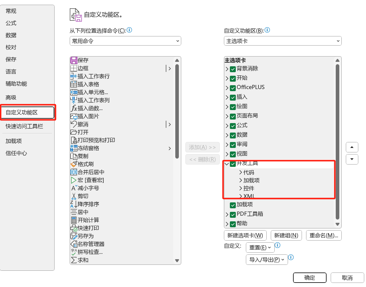 如果没有找到【开发工具】,点击【文件】找到【选项】按钮,在后面的弹窗,找到【自定义功能区】勾选上【开发工具】就可以在菜单上显示了