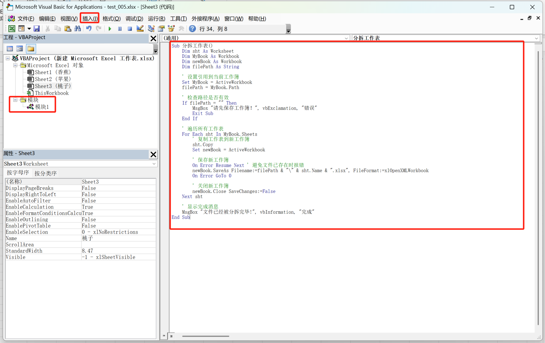 在点击【查看代码】后在弹出的页面上,选择【插入】选择【模块】,点击下方的模块1,输入相应的代码。点击【运行】